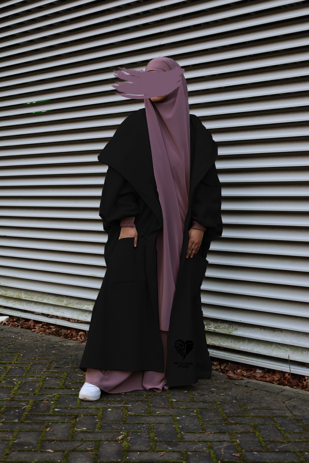 Our long jilbab jacket ensures more warmth down the length of your body to keep the chills from windy days at bay. 2 cosy pockets to keep your hands warm or store your keys and phone. Stylish oversized hood to keep extra warmth on your head on those freezing days. Universal size means this jacket will fit any sister from petite to plus size. A truly unique piece and versatile to match with any colour abaya or jilbab. Great to carry you through Winter and cooler Spring months.