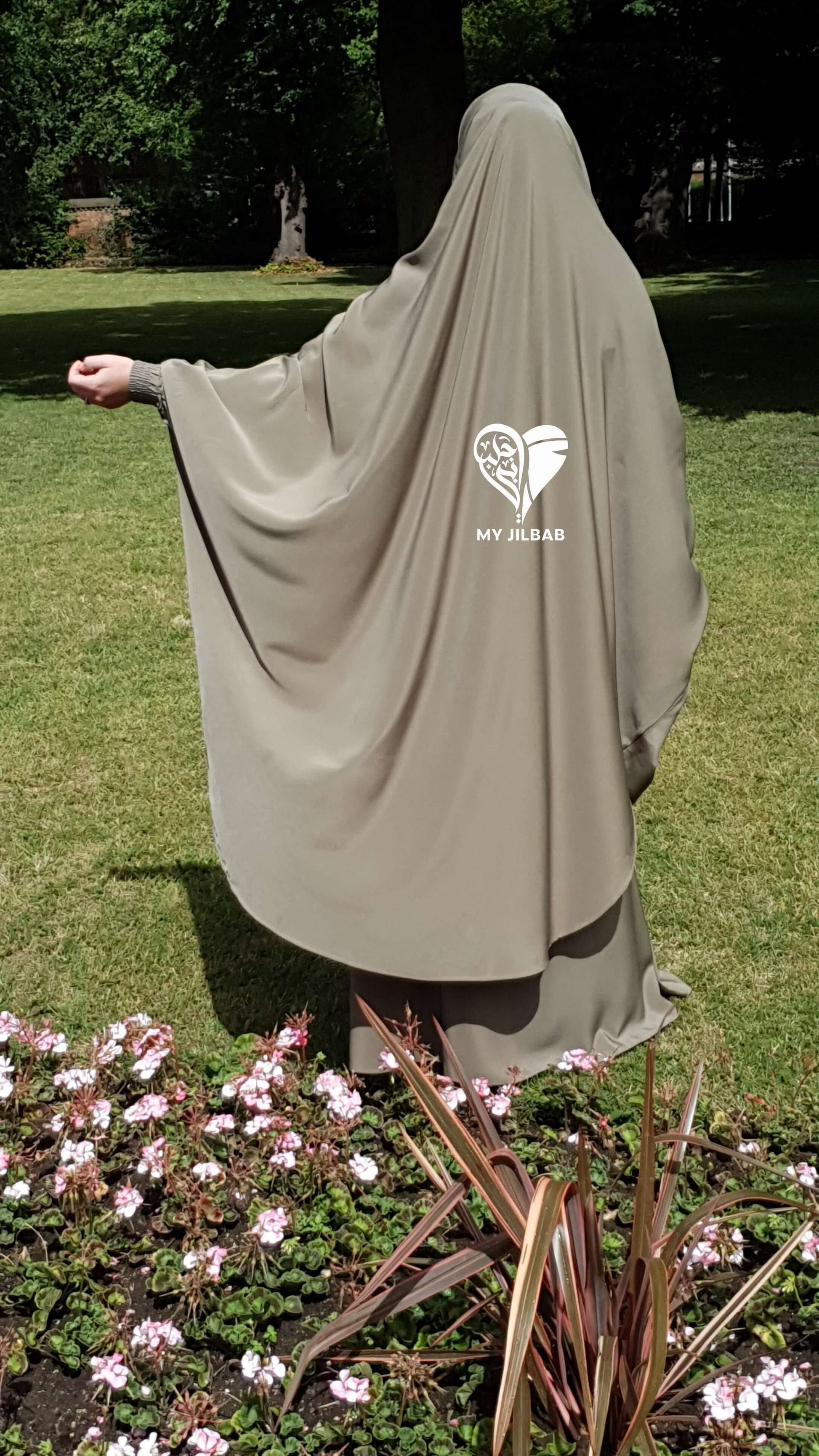 Two piece, high quality jilbab in a very lightweight, silky crepe fabric. Features elasticated cuff sleeves and a tie-back headband. Perfect face fitting. Skirt has elasticated waistband.